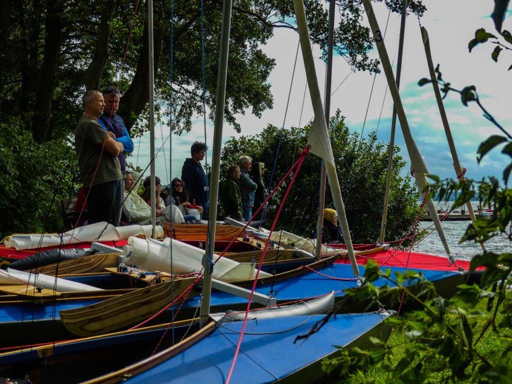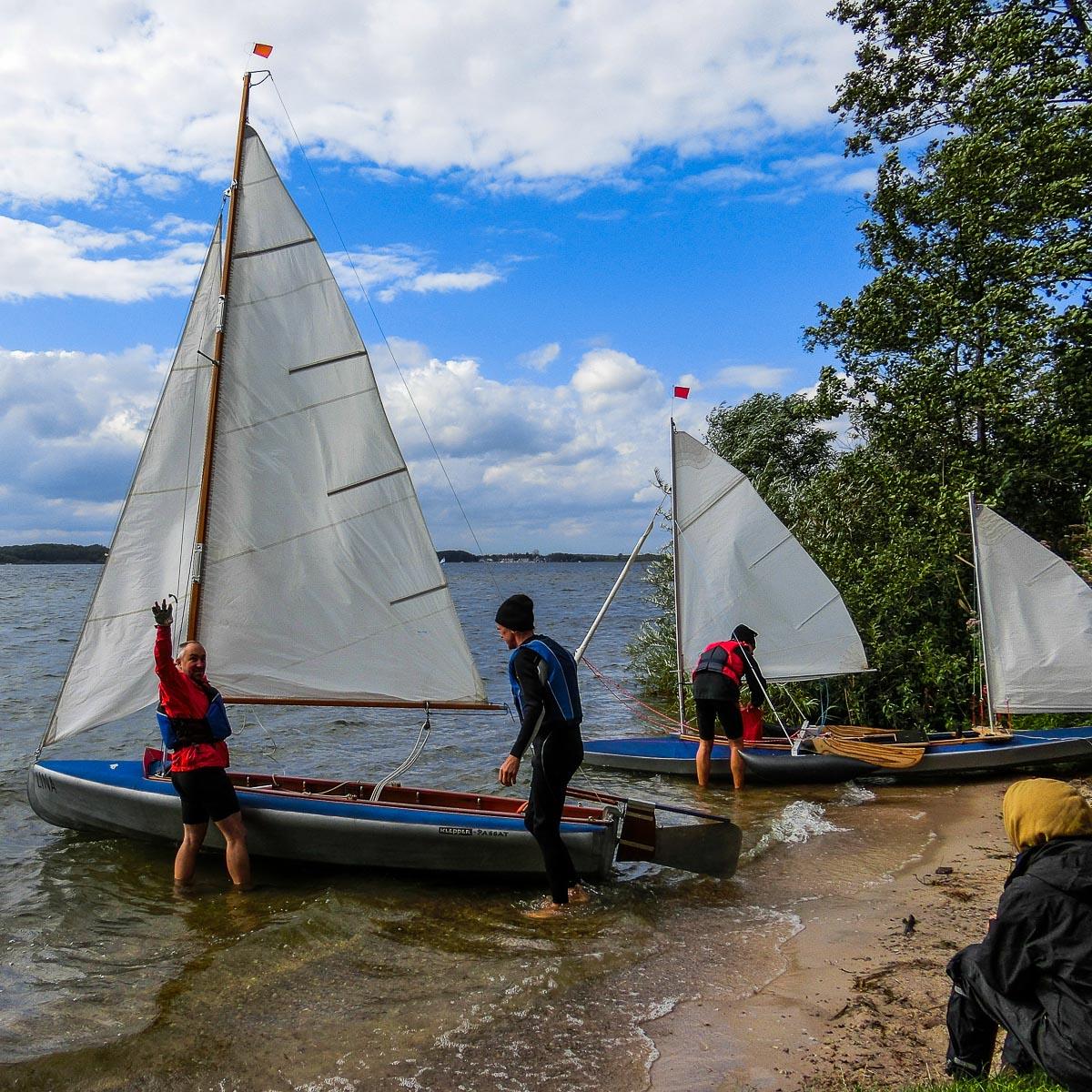 Nach und nach kommen weitere Faltbootsegler zu uns ins Basislager. Von der kleinen Anlegestelle aus kann ich schon am Vortag des Criteriums eine bunte Schar verschiedenster Kajakfaltbootvarianten mit Beseglung bestaunen. Am liebsten will ich gleich eine Proberunde drehen, denn die Herausforderung etwas Neues zu segeln reizt mich sehr. Doch es gibt noch jede Menge für den folgenden Tag vorzubereiten. In Berts gemütlichem Bus wird der eventuelle Kurs für das Faltbootsegel-Criterium besprochen und der Ablauf geklärt. In diesem Jahr soll es erstmals eine Klasse für Kajaks oder Kanadier mit festem Rumpf geben. Bert und ich werden Fotografieren und Filmen.